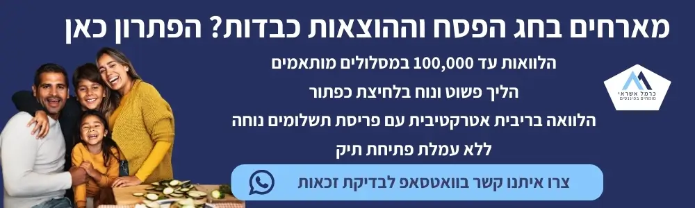 בגלל ההוצאות הגבוהות והרצון למצות את חופשת הפסח עד תומה, רבים בוחרים לקחת הלוואה שתסדר להם את הוצאות החג, אשר חורגות מתקציב המשפחה. הלוואות לחג הפסח מוצעות על ידי גופים מגוונים החל מהבנקים השונים, חברות אשראי, וועדי עוברים ועוד. לפני שמחליטים ממי לקבל הלוואה, כדאי לבדוק את התנאים השונים בהם כל הלוואה מוצעת, כדי שההלוואה ותנאי ההחזר שלה, יהיו מותאמים לכיסנו.